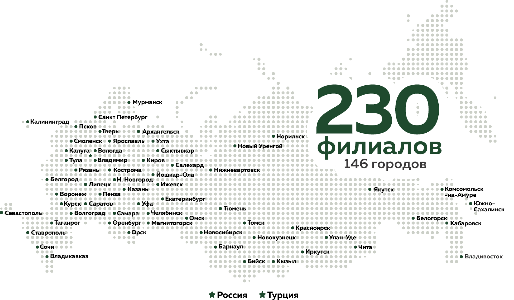 У нас филиалы в 146 городах России. Даже в командировке клиенты могут посещать любимую клинику и быть уверены в уровне сервиса и результате, ведь везде единые стандарты.
